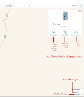 5– بعد اختيار الجهاز ستظهر لنا خريطة تحدد موقع الجهاز ومعها مجموعة من الخيارات اما اذا كان الجهاز غير متصل فسيعرض لك  ايقونة الجهاز فقط دون تحديد موقعة مع امكانية تطبيق خيارات اخرى ..