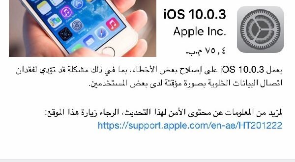 تسعى شركة ابل دائما الى متابعة وحل المشاكل التي تطرا على انظمتها اولا باول  ومع اصدار الشركة لنظام ios 10 واصدار الايفون 7 والايفون 7 بلس ظهرت بعض المشاكل فاصدرت الشركة تحديثا تلو الاخر لاصلاح بعض المشاكل و اليوم قامت بإصدار تحديث iOS 10.0.3 حصريا للهاتفين iPhone 7 و iPhone 7 Plus. وكما يتضح  فهو بمثابة تحديث فرعي يهدف إلى إصلاح مجموعة من الأخطاء والمشاكل المؤقتة التي يعاني منها بعض مستخدمي الهاتفين iPhone 7 و iPhone 7 Plus مثل مشكلة فقدان الإتصال بشبكات 3G و 4G.