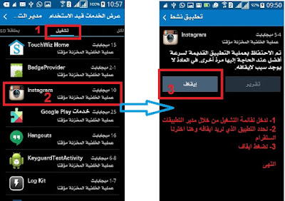 من نفس مدير التطبيقات انتقل الى قائمة (تشغيل) عن طريق السحب من اليمين الى اليسار ستلاحظ القائمة تظهر امامك وستجد تطبيقات في فئة التشغيل وهذا يعني ان التطبيقات التي في هذه القائمة تعمل الان وهنا يجب الحذر في التعامل مع كل تطبيق لذا يهمنا في هذه القائمة الالعاب والتطبيقات المعروفة التي تم تحميلها من سوق قوقل بلاي فقط بينما تطبيقات النظام والغيرمعروفة لاتقم بالعبث بها حتى لايتوقف جهازك ويتعرض للعطل ..طبق الخطوات كما في الصورةحيث تم اختيار تطبيق انستقرام :